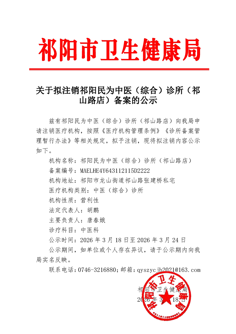 关于拟注销祁阳民为中医(综合)诊所(祁山路店)备案的公示