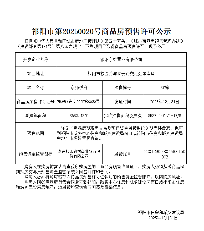 祁阳市第20250020号商品房预售许可公示-京师悦府5#